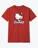 Featuring the beloved Sanrio character Hello Kitty on the front in a sweet, minimalist design. Set on a vibrant red tee, it’s perfect for casual days, playful outfits, and anyone who loves timeless cute style with a pop of color!